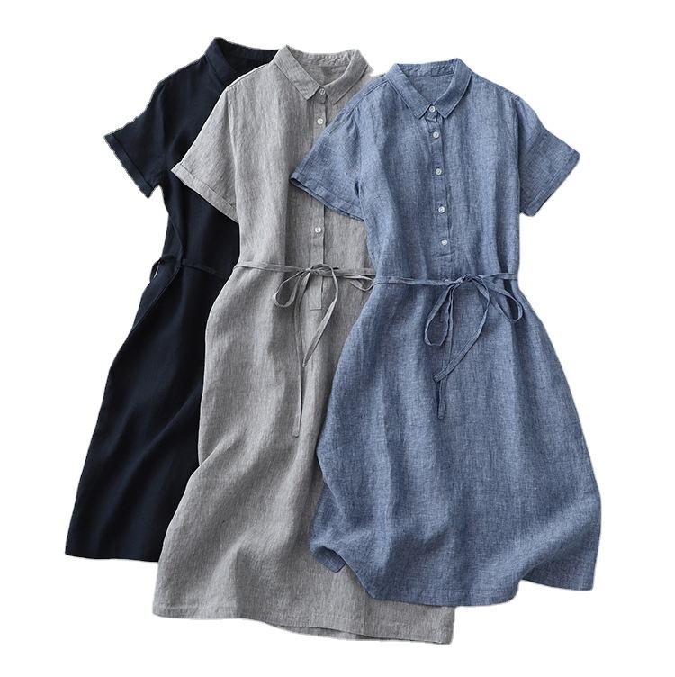 2023 Women Dress Custom logo High Quality Clothing Women O-neck Linen Plain Drawstring Waist Loose Casual Dresses