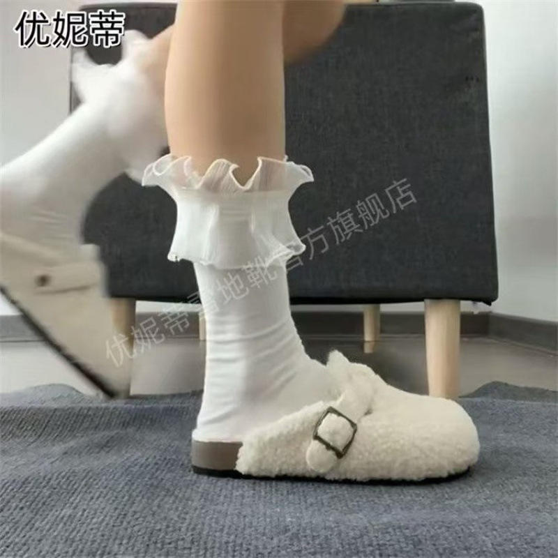 2024 Autumn Winter New Fashion Fur for Slippers for Women Off-White Thick-Soled Outdoor Shoes French Flat-Soled Height-Enhancing