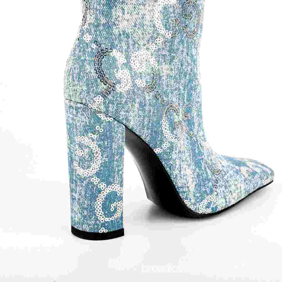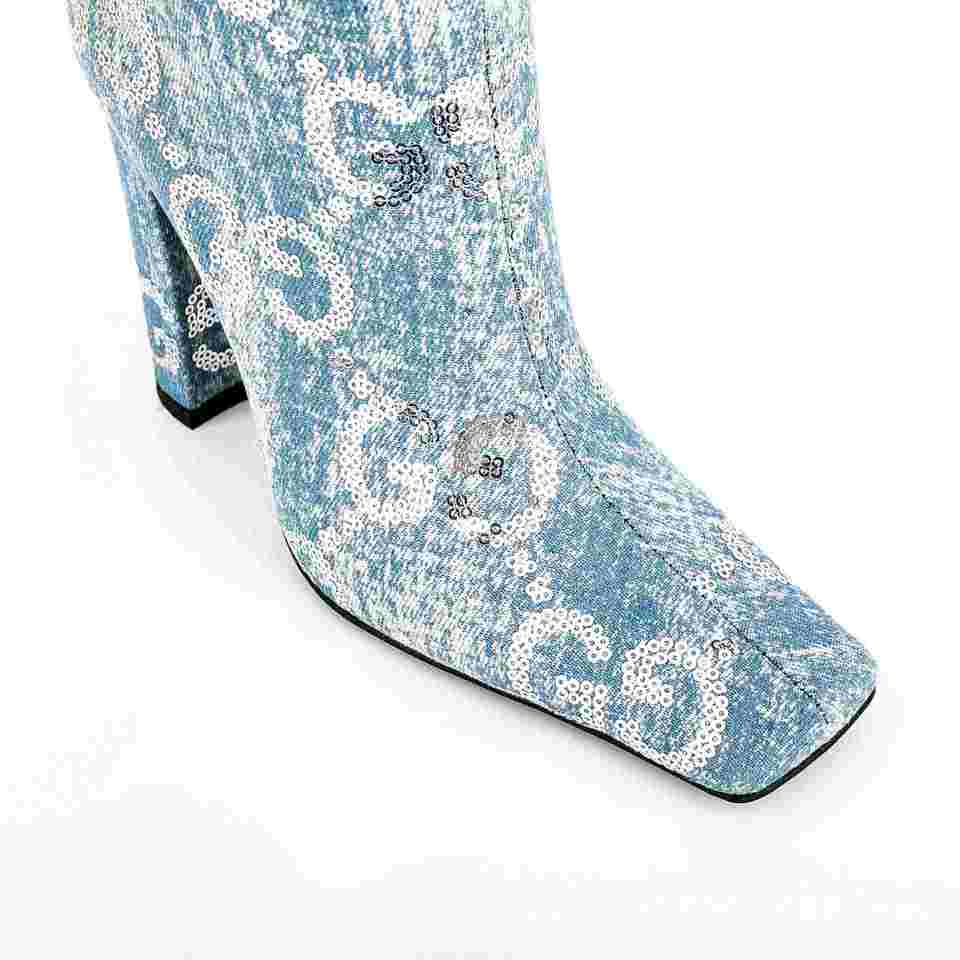2024 Autumn Winter Waterproof Denim Patchwork Long Knee Boots Sequins Letters Design Warm Chunky Heel for Outdoor Shopping