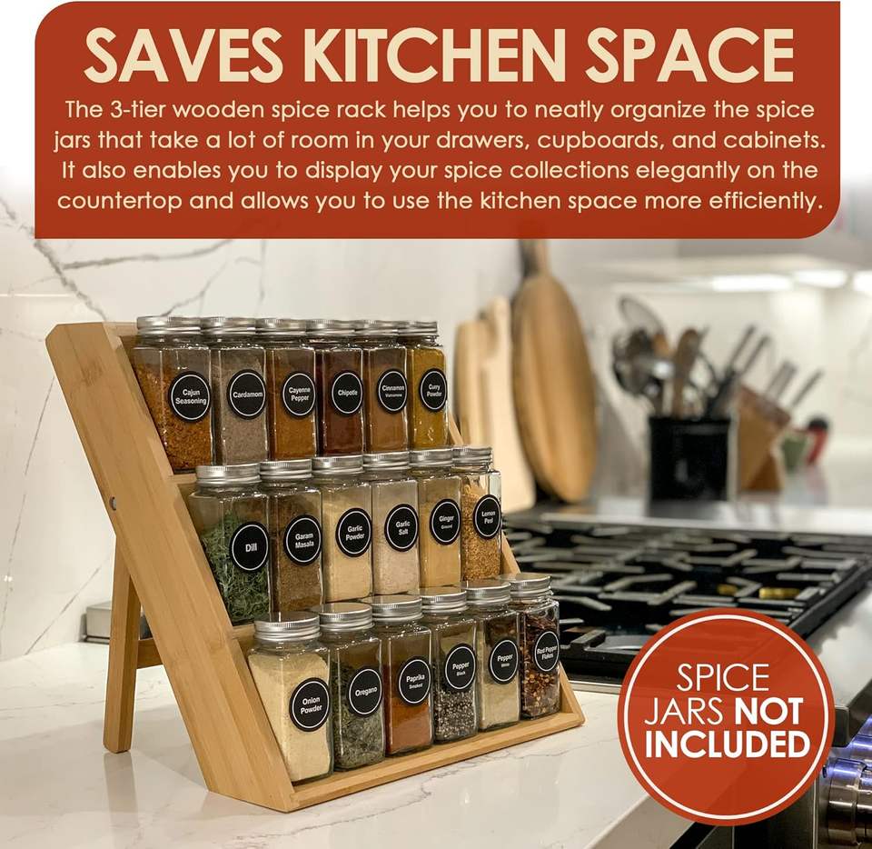 2024 Free Standing 3-tier Seasoning Jar Organizer Holder Wooden Bamboo Spice Rack for Kitchen Cabinet Drawers and Countertop