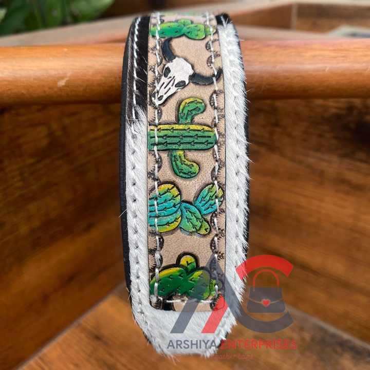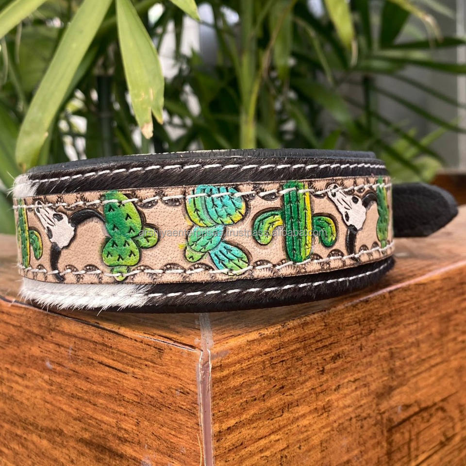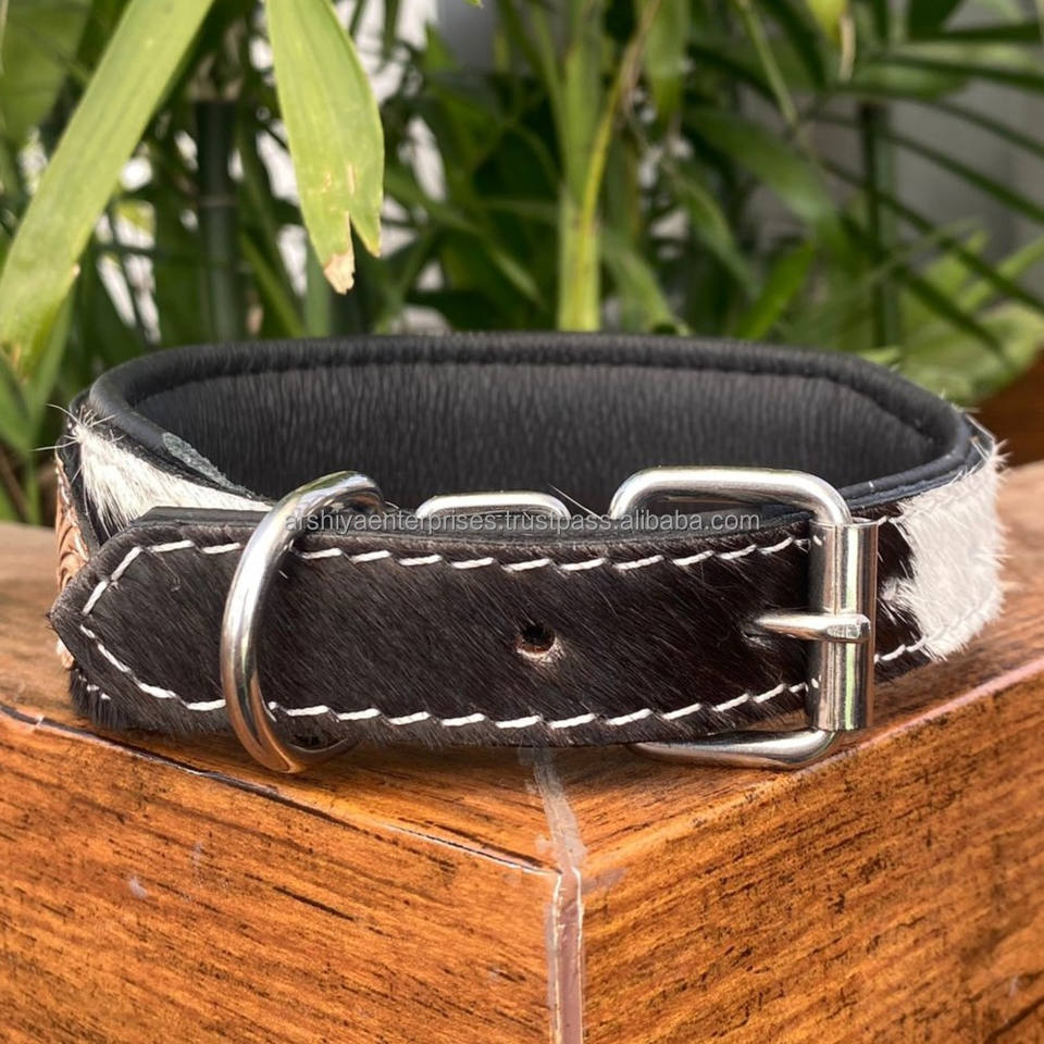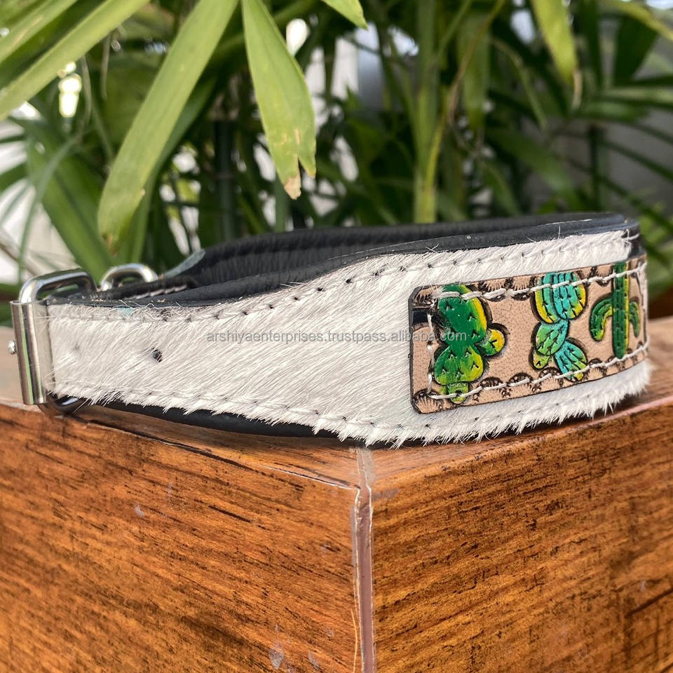 2024 High Quality Adjustable Handmade Tooled Leather Pet Collars Heavy Duty Genuine Hair on Cowhide Leather Padded Puppy Collars