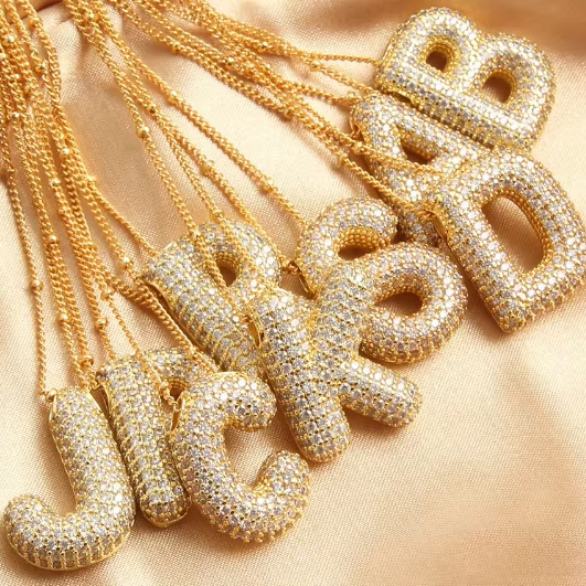 2024 Hot Sale Small Gold Plated Brass Dia Zircon Mini Balloon Bubble Letter Initial Pendant Necklace