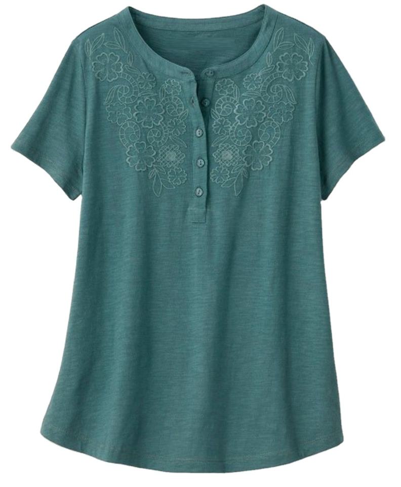 2024 Hot Sale Women Fashionable Open Mind Eyelet Henley T Shirt