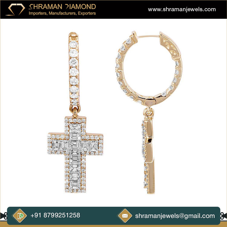 Trendy Classic Design 925 Solid Silver Iced Custom Baguette Lab Grown Diamond Jesus Cross Hoop Earrings for Women Fine Jewelry