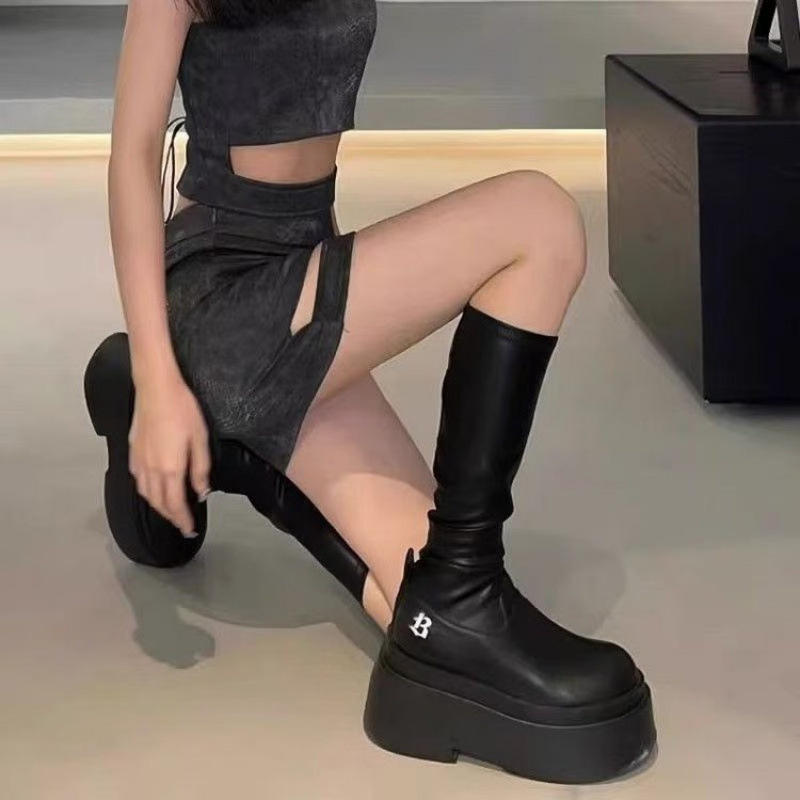 2024 New Autumn Winter Women's Elastic Slim Black Satin Round-Toe Long Boots Internet Celebrity Hot-Selling High-Heeled Shoes