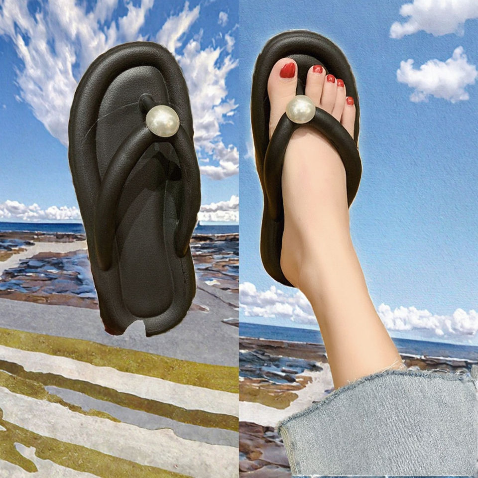 2024 New Candy Color Pearl Open Toe Flip Flops Women Non-Slip Beach Sandals Printed Design Lightweight Flat Summer