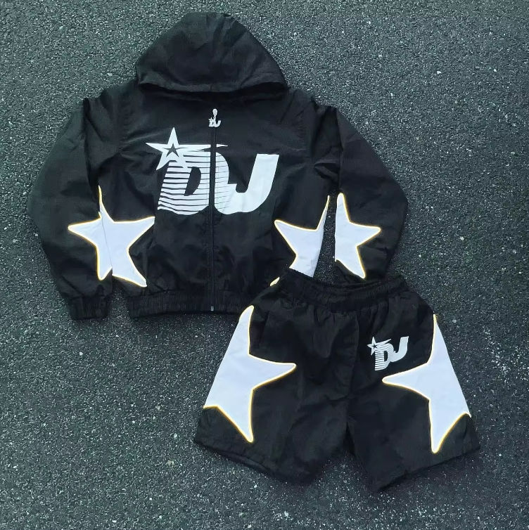 2024 New Design Eco-Friendly Men's Casual Streetwear Windbreaker Tracksuit Shorts Set Solid Puff Print Two Piece Full Zip Hoodie