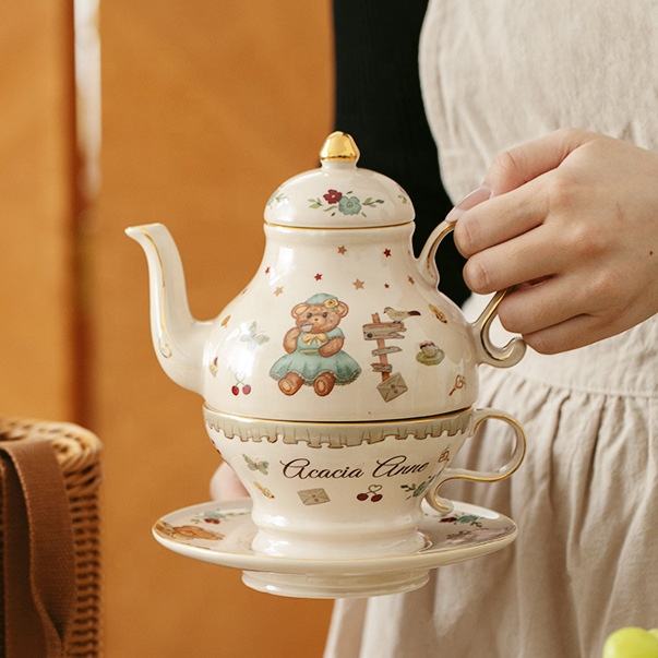 2024 New Style Fine Porcelain Tea for One Set Party Gift Boxed Lovely Bear Vintage Coffee Cup and Saucer Gold Rims With Teapot
