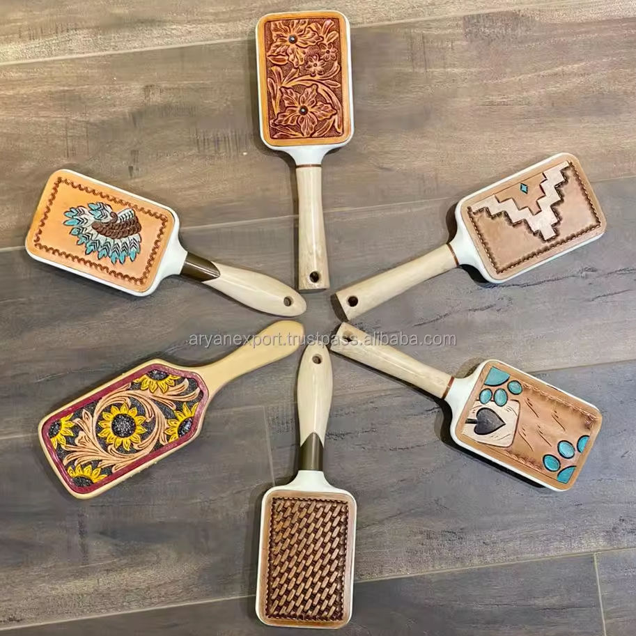 2024 New Trending Real Hand Tooled Leather Cowgirl Hair Brush Combs Boho Western Leather Combs Stylish Daily Uses Hair Accessory