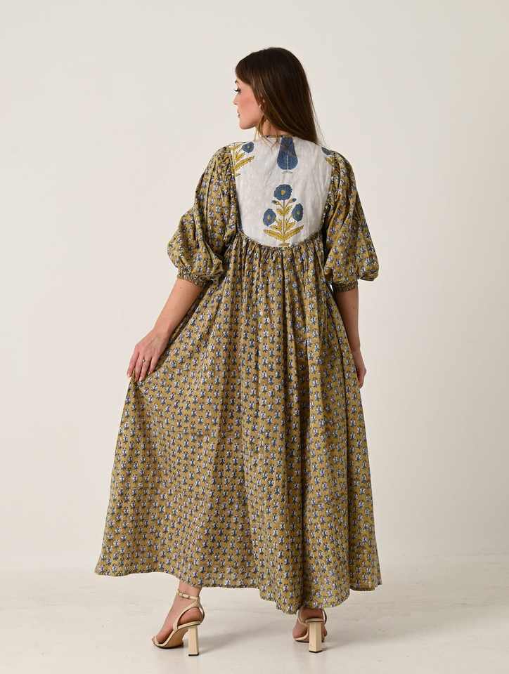Bohemian Solid Plaid Maxi Dress with Block Print Yoke Vintage Long Sleeve Modern Fit Casual Natural Waist Eco-Friendly for Women