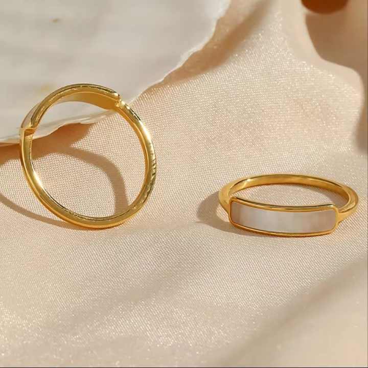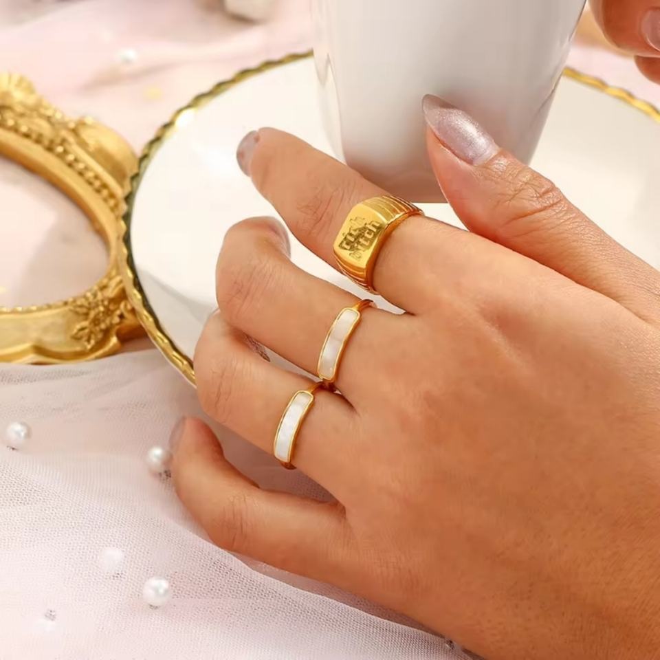 2024 Trendy Custom Rectangle White Shell Band Thin Ring Girls 18K Gold Plated Stainless Steel Rings for Women Jewelry