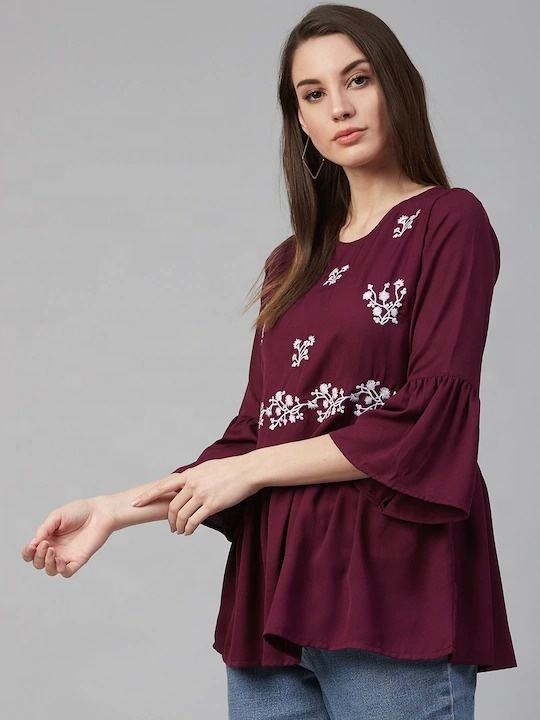 2024 Trendy Floral Embroidered Maroon Tunic Top for Women & Girls Stylish Summer Fashion Natural Waistline Woven Weave Zippers