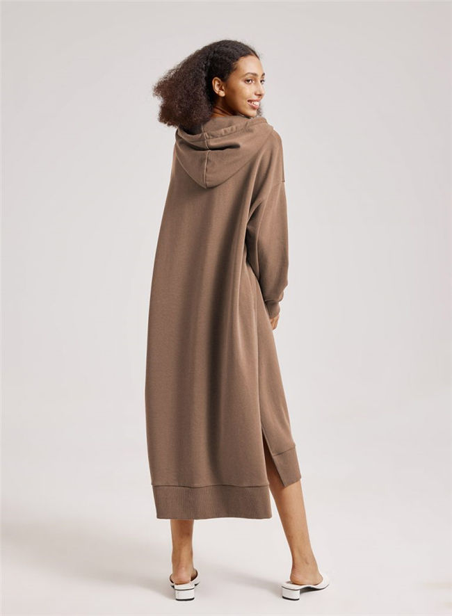 2024 Winter Custom Fashion Women Long Sleeve Cotton Pocket Midi Hoodie Dress With Side Slit