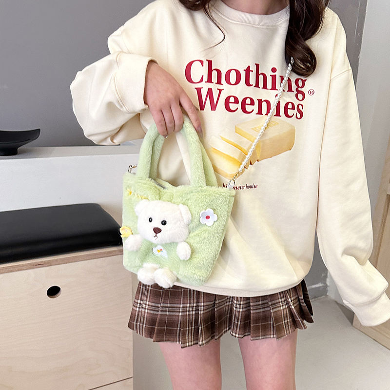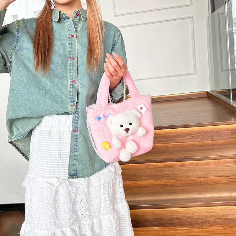 2024 Women's Fluffy Tote Bags Top-Handle Crossbody Handbag with Plush Bear Design for Autumn and Winter Use Wholesale