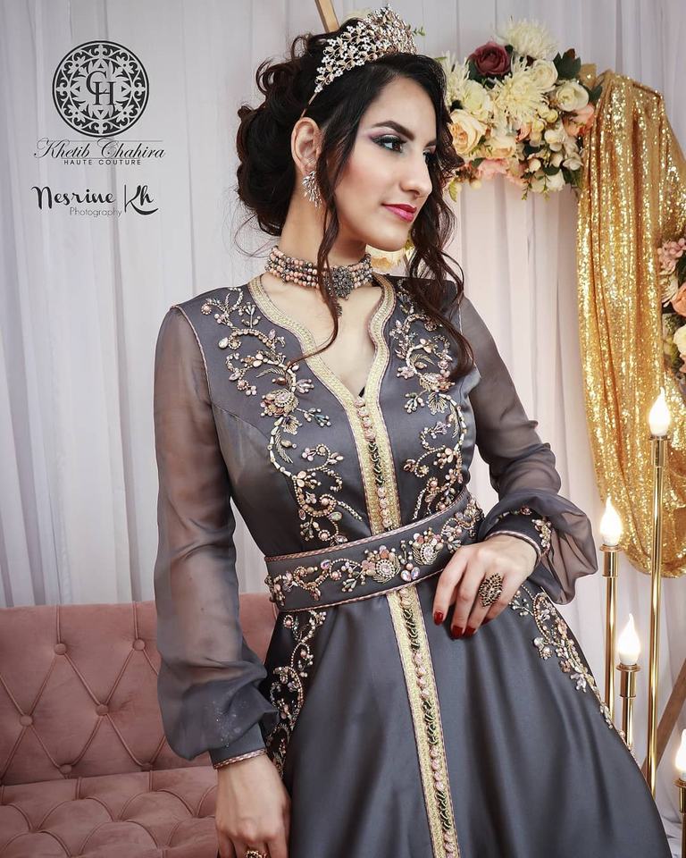 2025 2026 New Arrival Moroccan Caftan Handmade Embellished Embroidery Grey Silk Fabric Casual Wedding Dress Muslim Traditional
