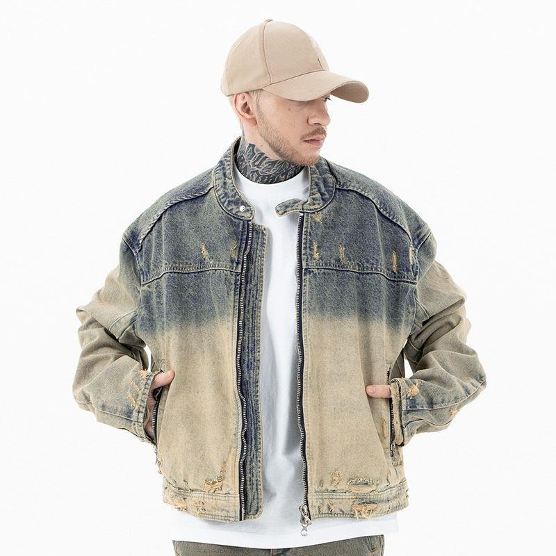 2025-26 Spring Plus Size Men's Denim Jacket Stand Collar Two Way Zipper Loose Jacket Distressed Vintage Washed Jacket