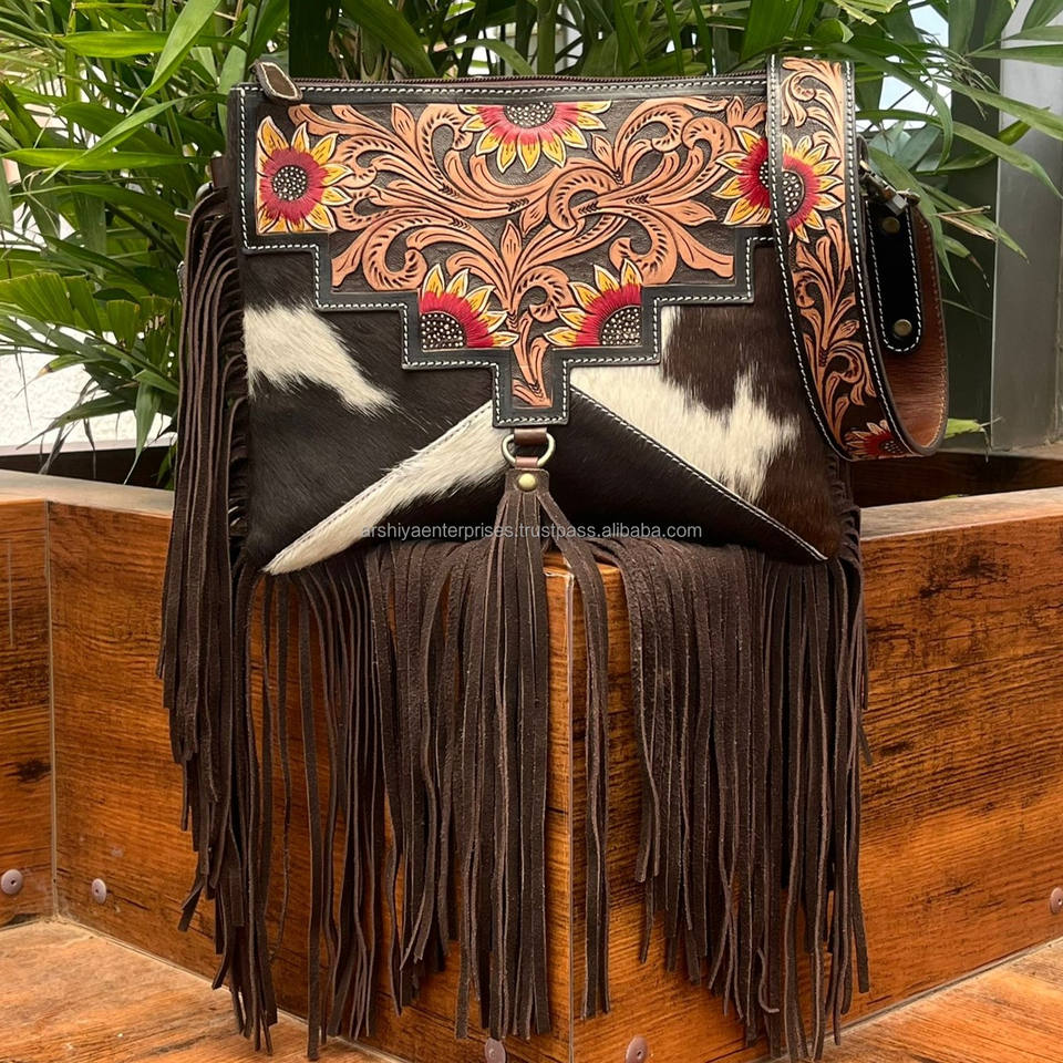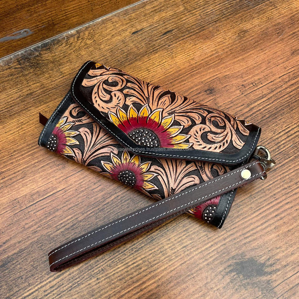 2025 Best Selling Sunflower Design Tooled Cowhide Leather Fringe Bag & Tooled Genuine Leather Wallet for Women 2 Piece Combo Set
