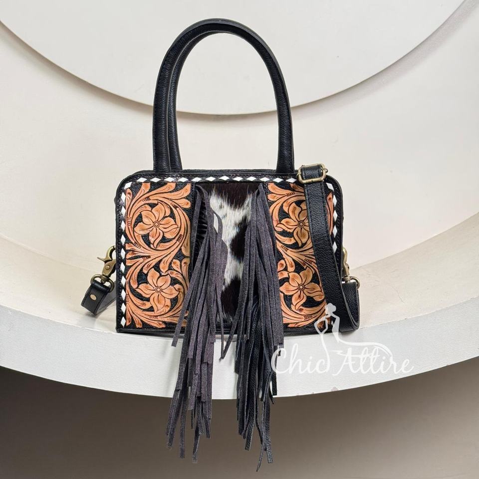 Product name:Hand Tooled Cowhide Leather Fringe Mini Tote Bag