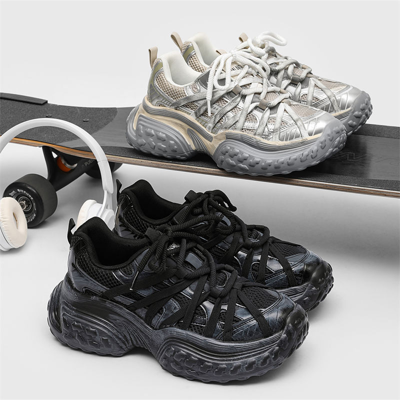 2025 Breathable Chunky Sneakers Rubber Midsole Impact Absorption All-Black Urban Streetwear Futuristic Cushioned Walking Shoes