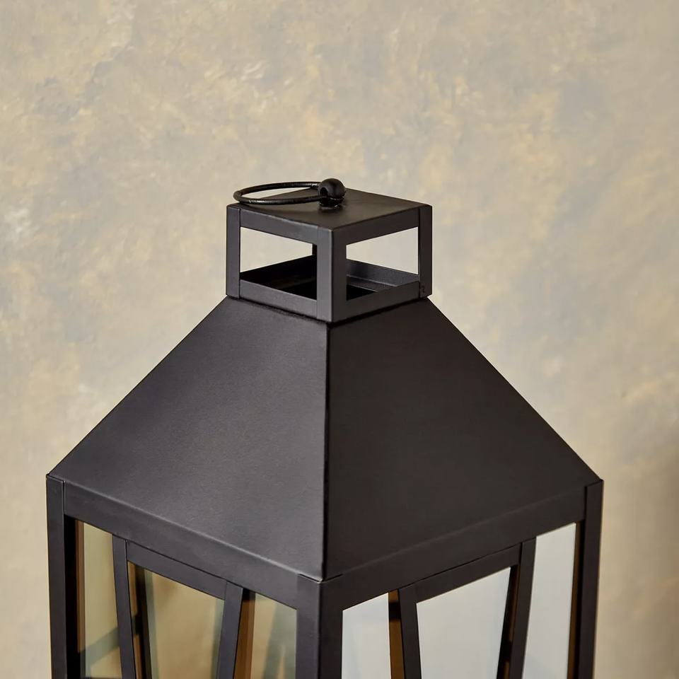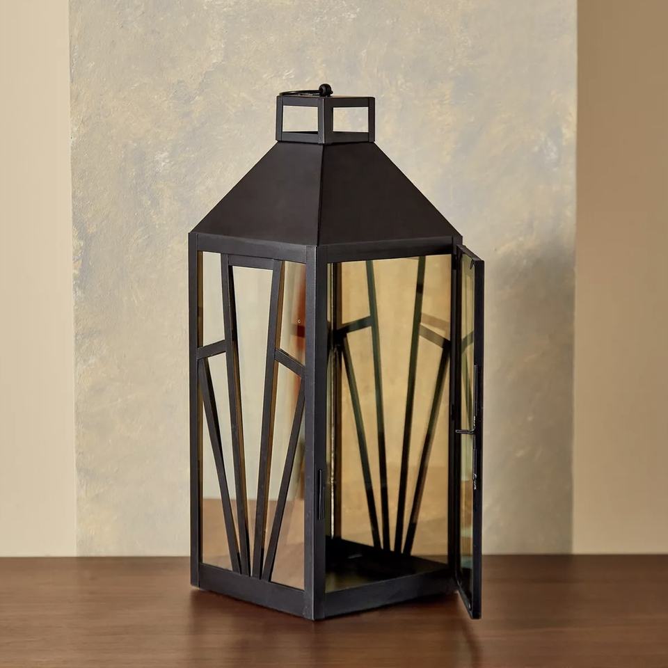 2025 Christmas Square Handmade Metal and Glass Designer Candle Lantern with Golden Glass and Black Metal for Table Floor Decor