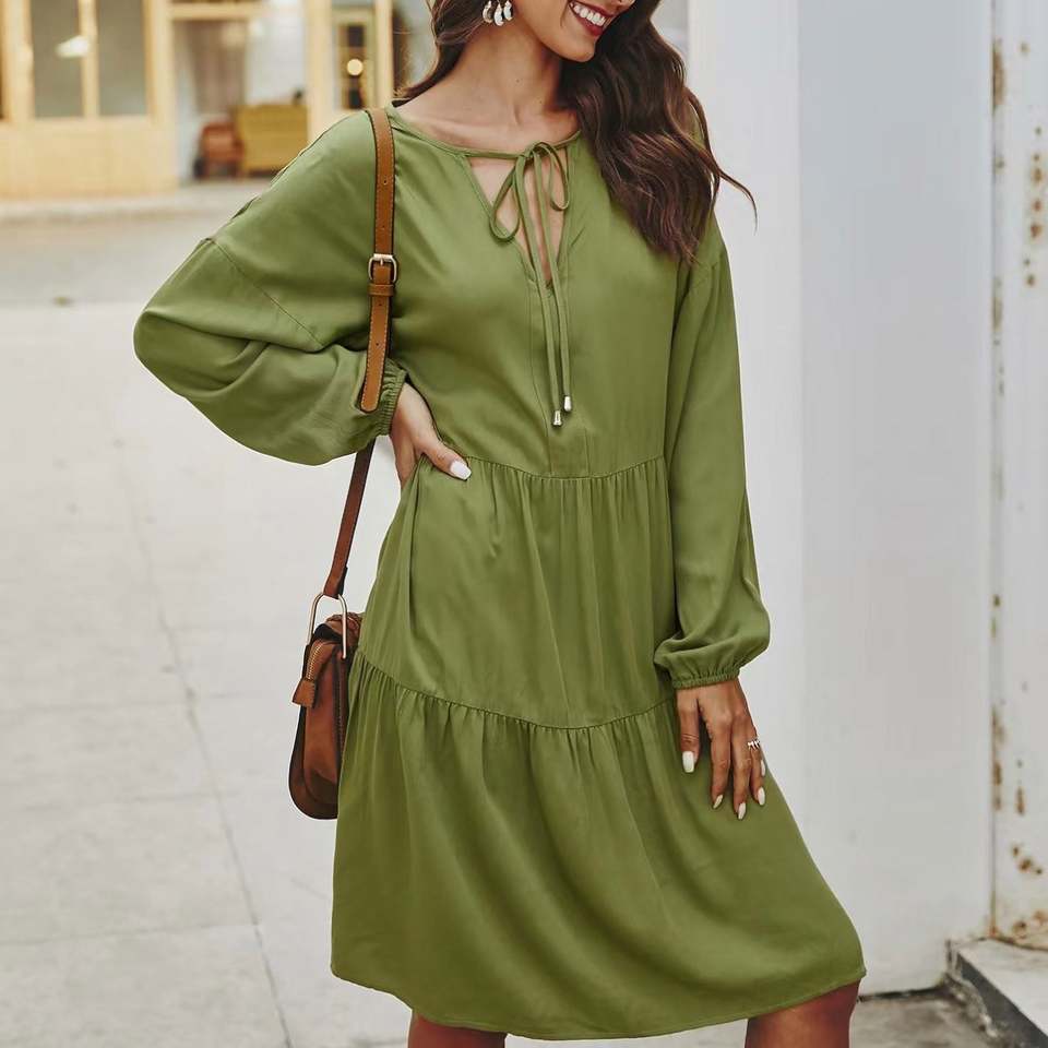 2025 Cross-border Long Sleeve High Waist Loose V-neck Solid Color Patchwork Skirt Mid-length Tied Dress