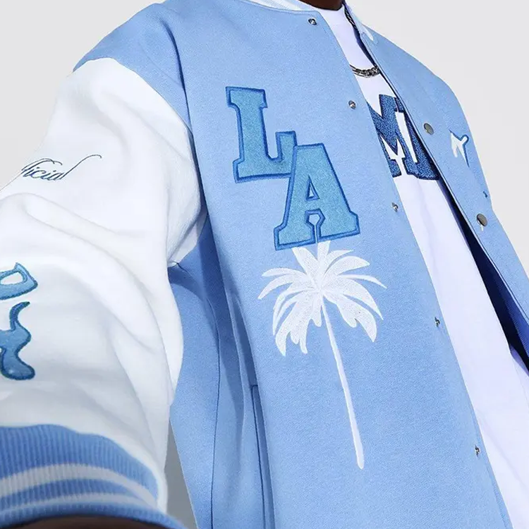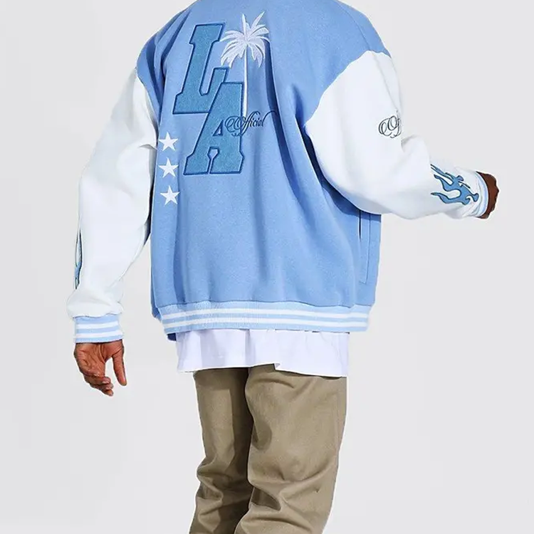 2025 Custom Chenille Embroidery logo Leather Sleeves Light Blue Baseball Bomber Letterman Varsity Jacket for Men