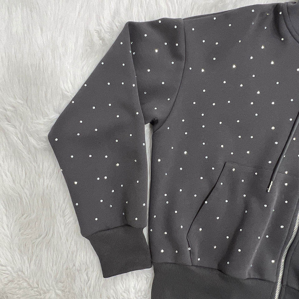 2025 Custom Manufacture Winter Casual Streetwear Rhinestone Zip Fleece Hoodie Sweat Pants Set Acid Wash Men Tracksuit 100%