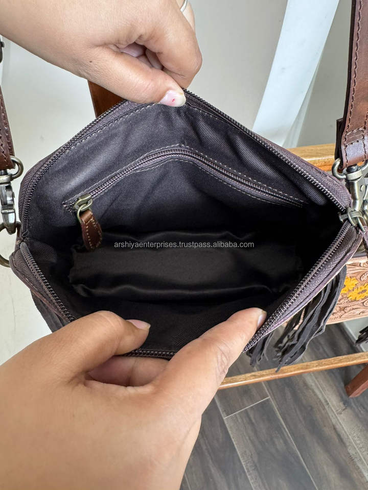 Product name:Hand Tooled Leather Sunflower Crossbody Fringe Bag