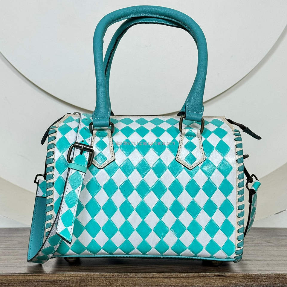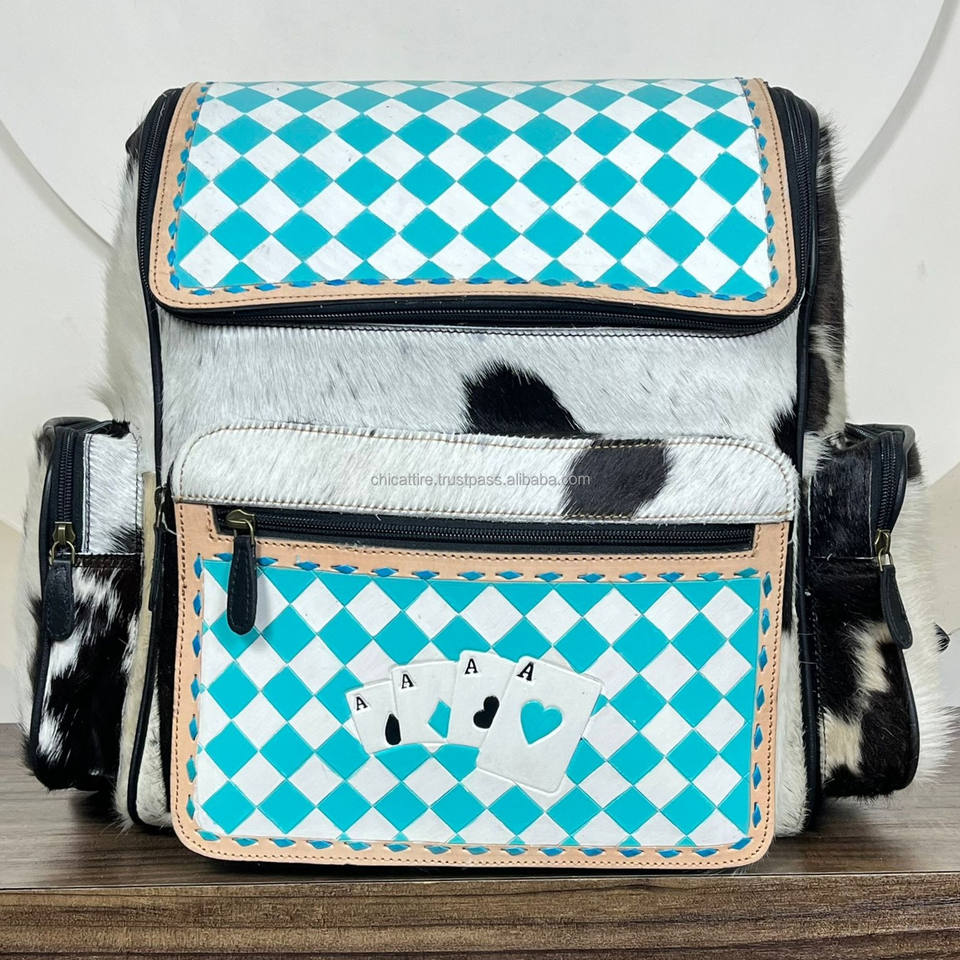 2025 Custom Western Turquoise Checkered Genuine Leather Diaper Backpack With Trendy Duffle Bag Cute Two Piece Matching Set