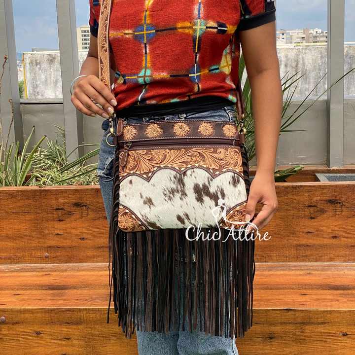 Hand Tooled Cowhide Leather Fringe Crossbody Bag