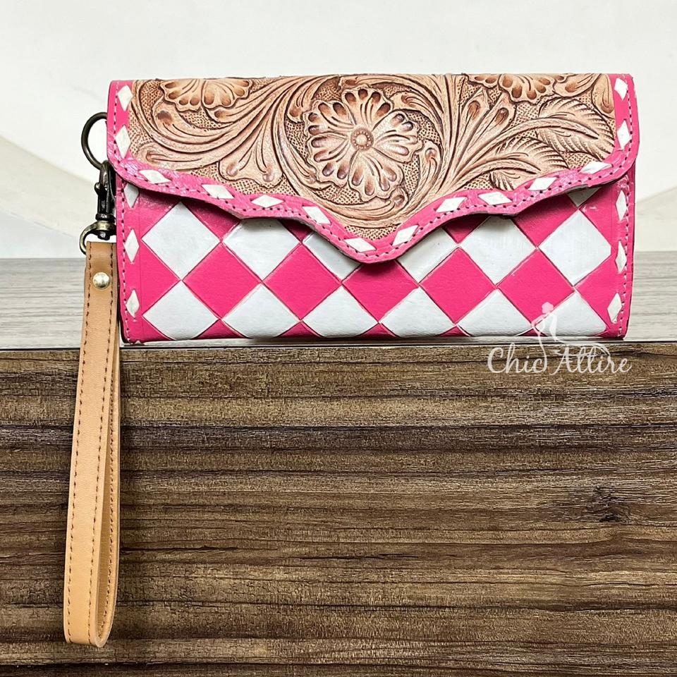 Product name:Hand Tooled Checkered Leather Wristlet Wallet