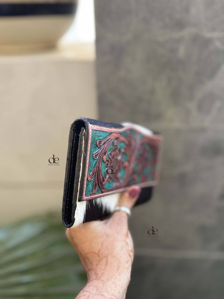 2025 Designer Luxury Hand Tooled Carving Leather Clutch Hair On Hide Fur Wallet Card Case Western Stylish Multi Uses Clutch