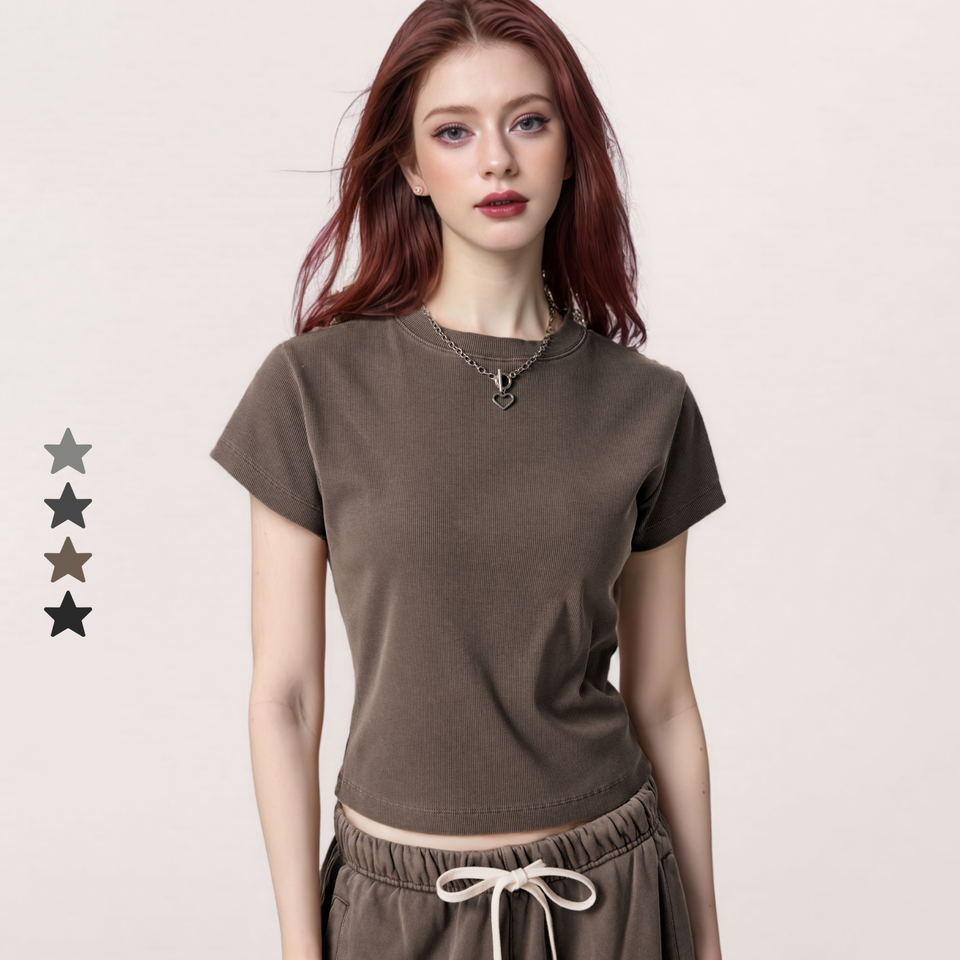 2025 European Streetwear Slim Fit Tee for Women Straight Shoulder Flattering Round Neck Summer T-Shirt