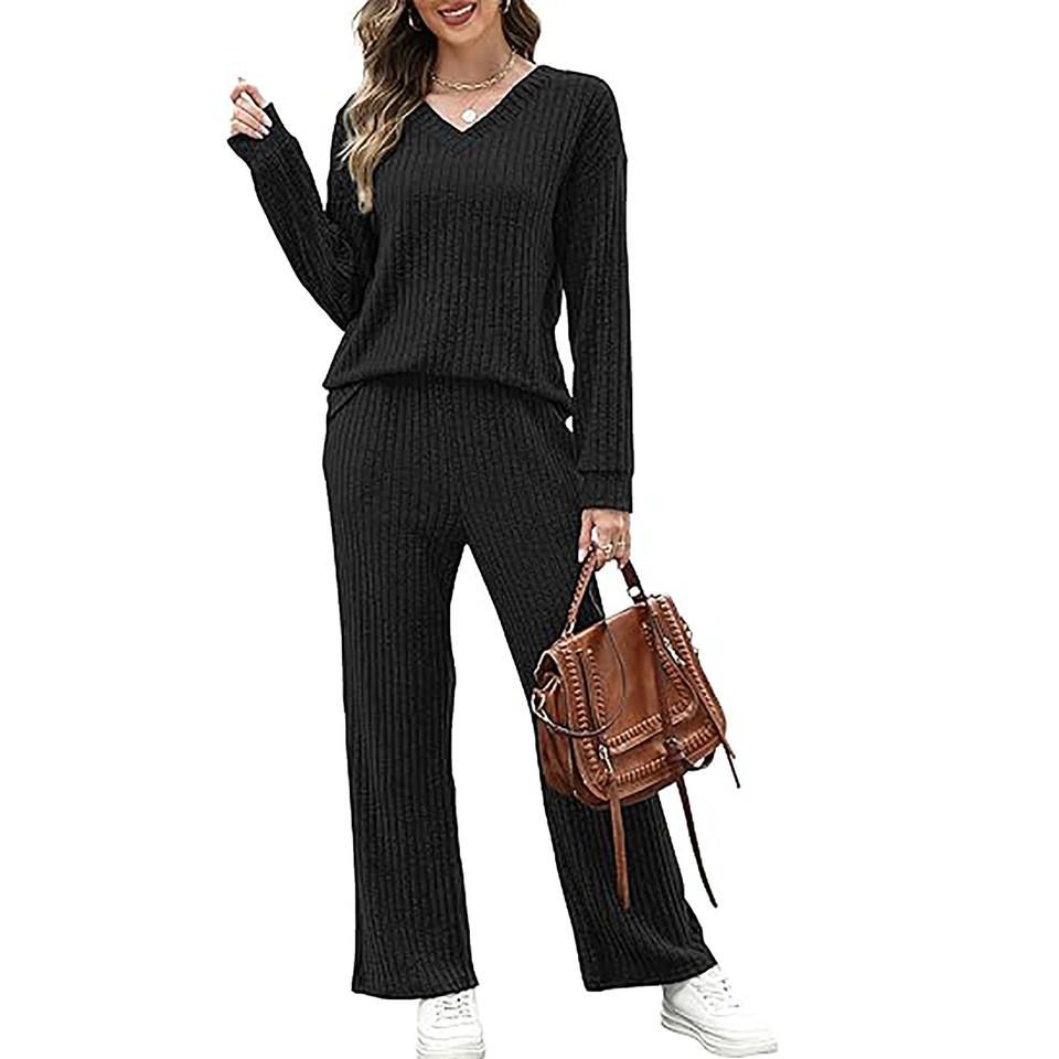 2025 Fall Outfits for Women Knitted Sweater Lounge Sets Elegant V-Neck Long Sleeve Tops and Straight Pants Soft Warm Wholesale
