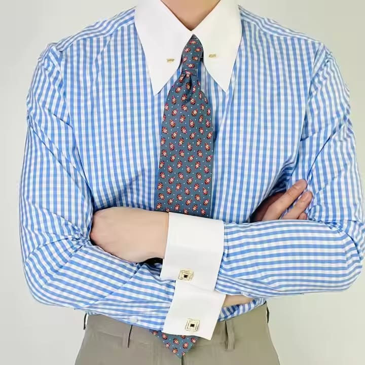 2025 Fashion Classic Style French Cuff Dress Shirt for Men Long-Sleeve Plaid Pin Collar Formal Wear Plus Size
