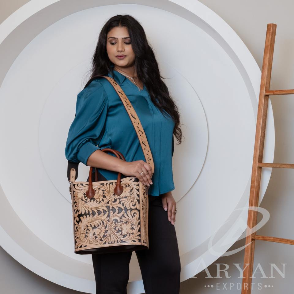 Product Name:Hand Tooled Leather Crossbody Tote Bag