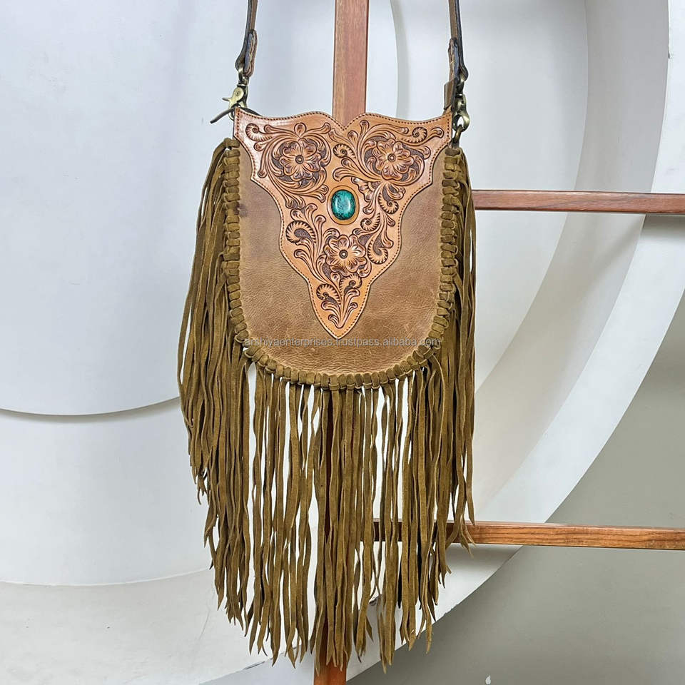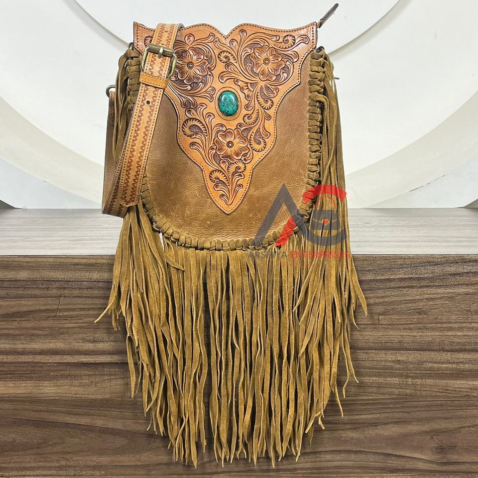 Product name:Hand Tooled Cowhide Leather Fringe Crossbody Bag