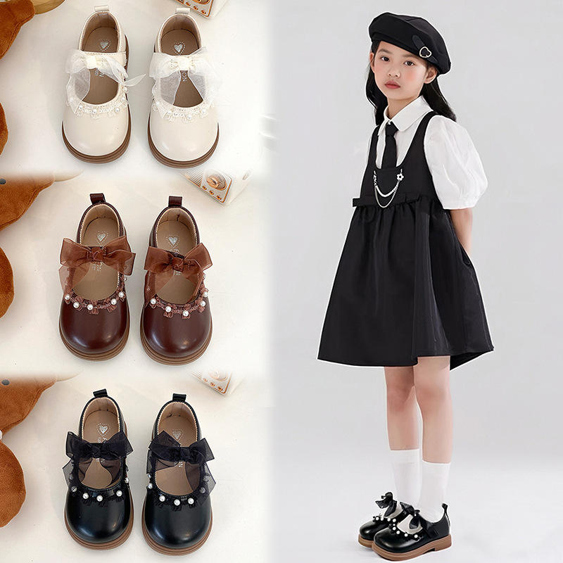 2025 Girls' Stylish Bow Pearl Leather Low-top Dress Shoes in Off-white/Light Brown/Black for Spring and Autumn Baby Girls