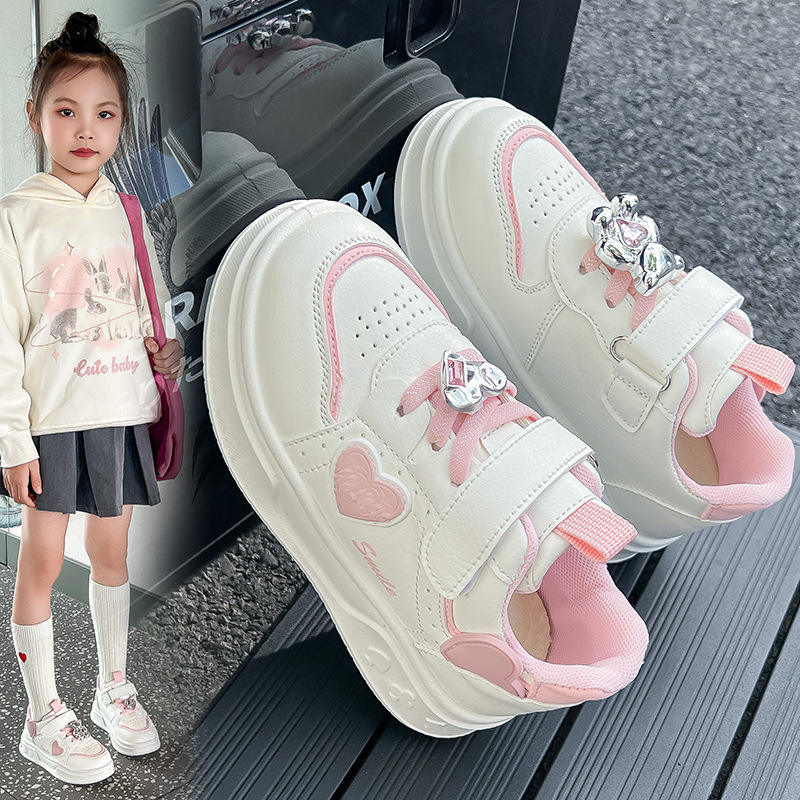 2025 Girls' White Sports Sneakers with Bear Love Design Soft Sole Casual Shoes for Spring Autumn Lighted Feature