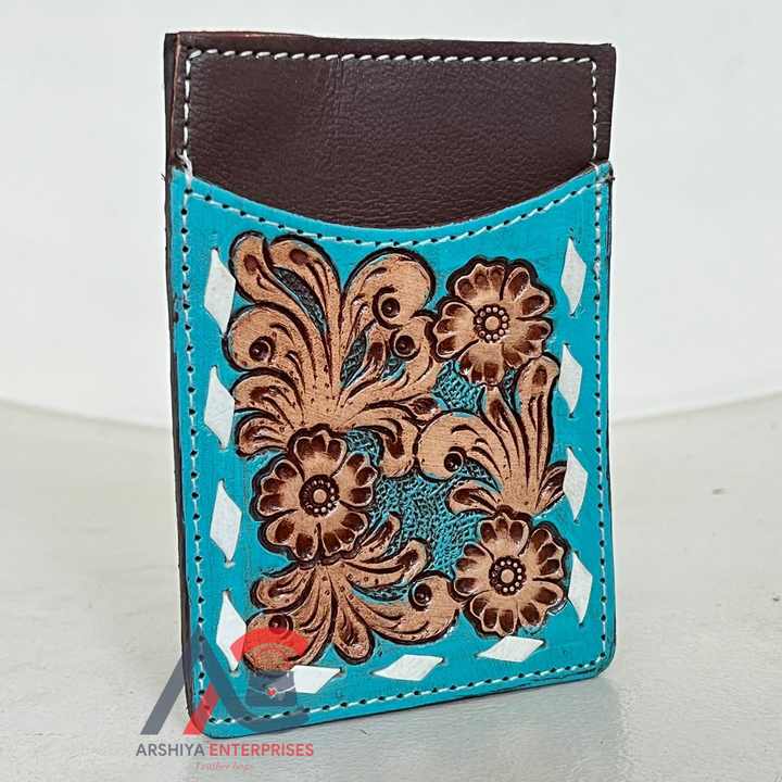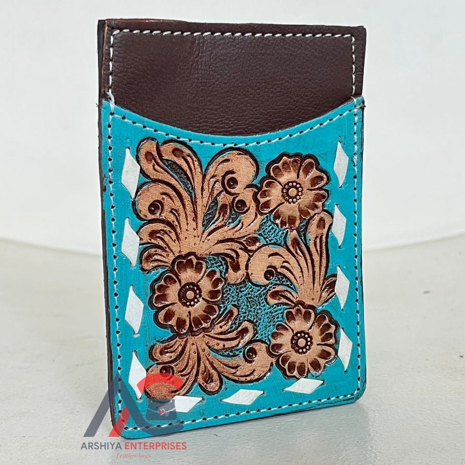 2025 Handmade Tooled Cow Leather Card Holder Minimalist Wallet Floral & Leaf Turquoise Design Front Pocket RFID Block Card Case