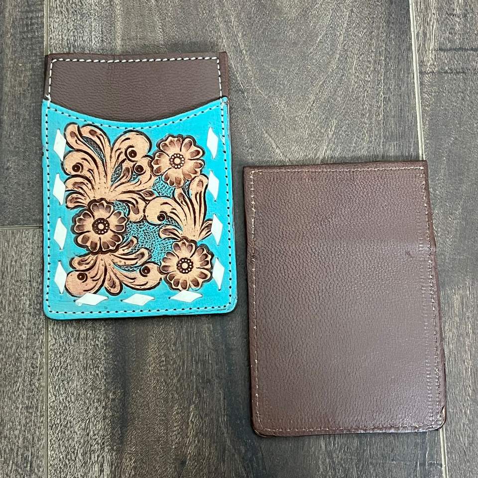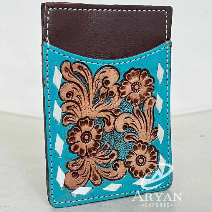 2025 Handmade Tooled Cow Leather Card Holder Minimalist Wallet Floral & Leaf Turquoise Design Front Pocket RFID Block Card Case