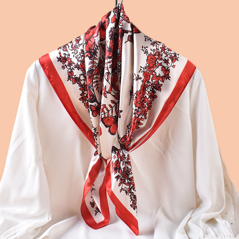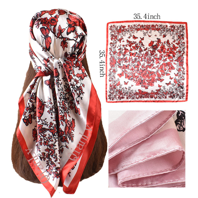 2025 High Quality Polyester Silk Satin Scarf Large 90x90cm Square Headscarf with Gloss Finish Printed Butterfly Design