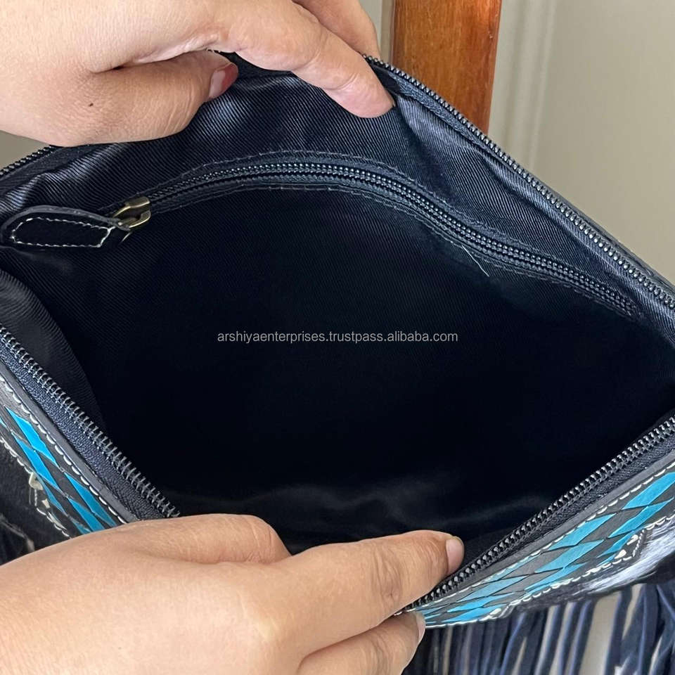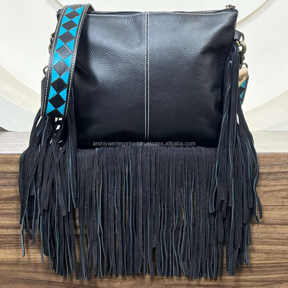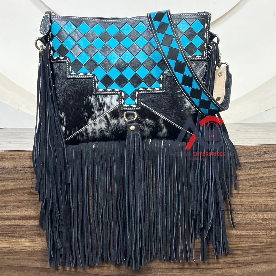 Hand Tooled Checkered Leather Fringe Crossbody Bag