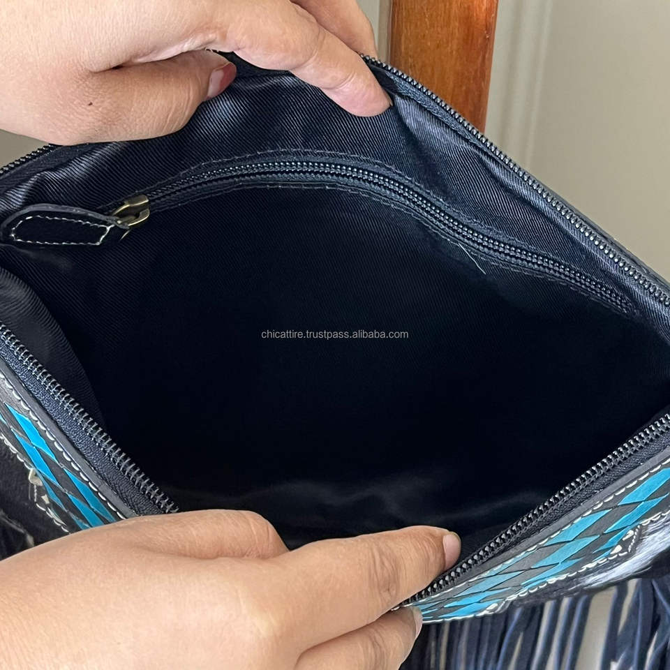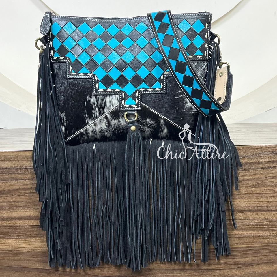 Product name:Hand Tooled Checkered Leather Fringe Crossbody Bag