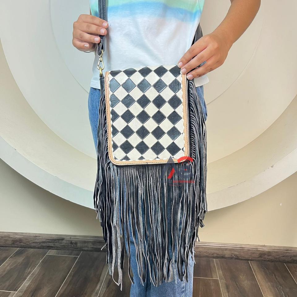 2025 Hot Selling Women's Hand Tooled Genuine Leather Crossbody Shoulder Fringe Bag Fashion Checkered Design Handbags for Women's