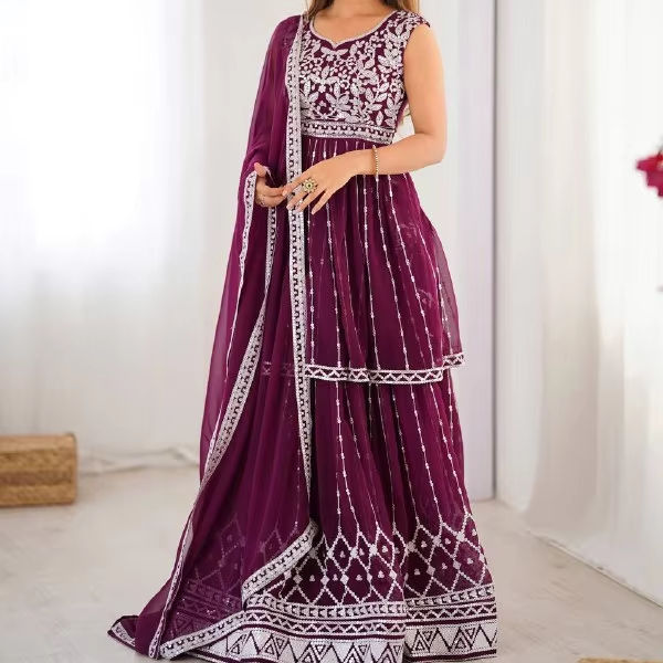 2025 Indian Festival and Sequence Work Faux Georgette Thread Front and Back Top Lehngaha Dupatta Set for Party Occasions