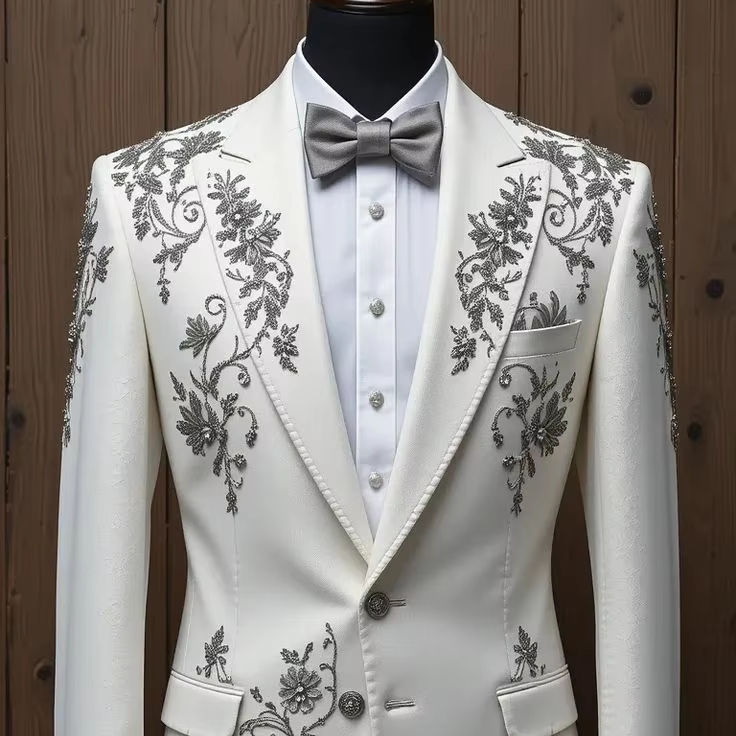 2025@Indian/Pakistani White Groom Stylish Tuxedos Suits Dress with Embellished Crystal Glass Beads Dabka Pearls Work for Wedding