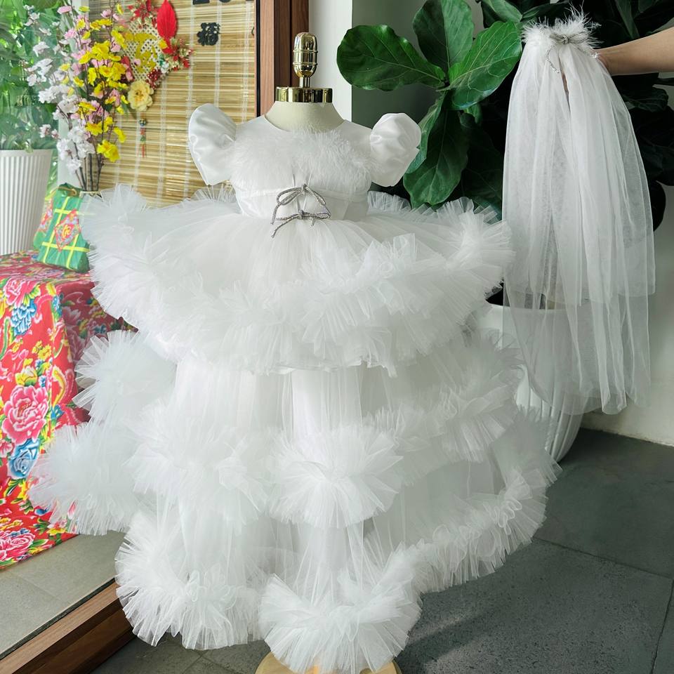 2025 Children Girls White Princess Style Fluffy Birthday Dress Glitter Beaded Floor-Length Luxurious Party Dresses Nhung Nguyen
