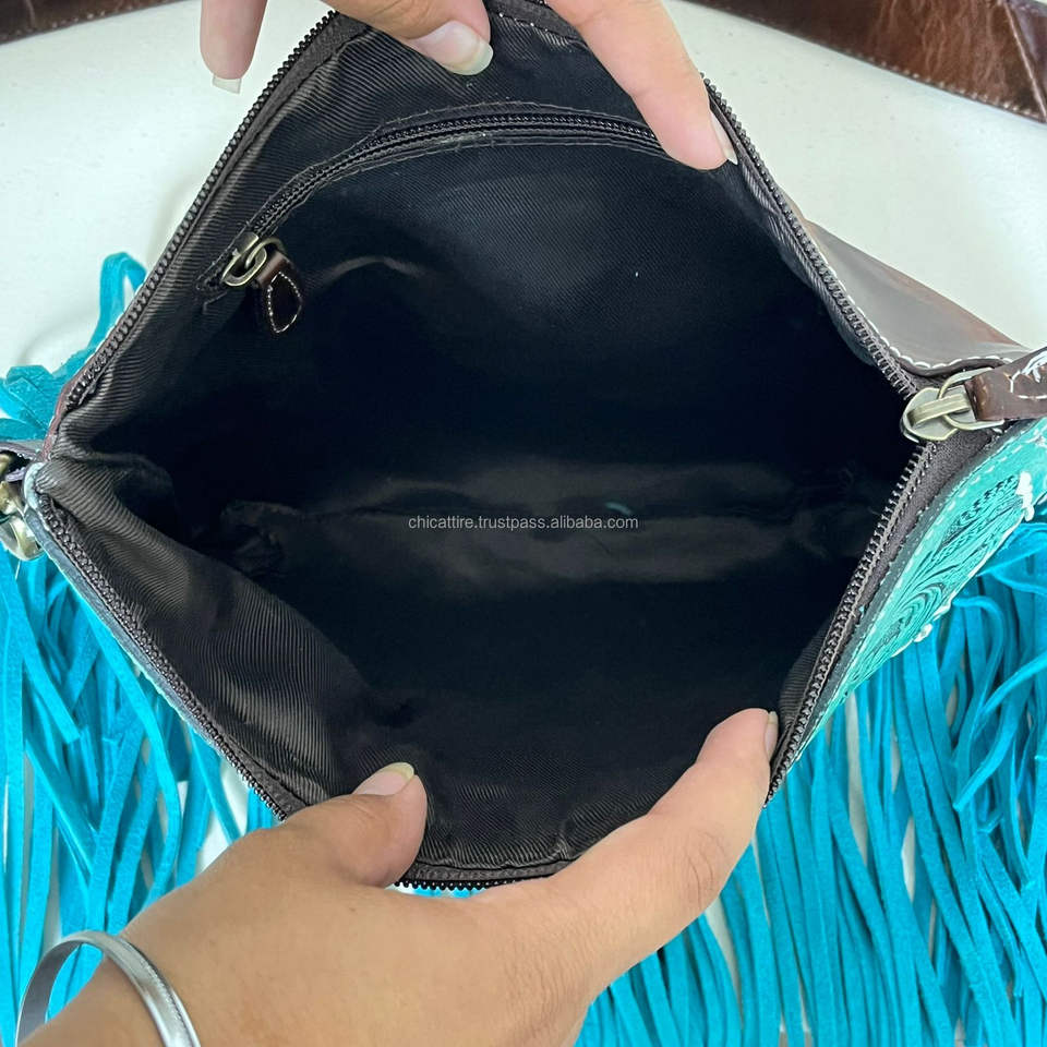Product name:Hand Tooled Cowhide Leather Fringe Crossbody Bag