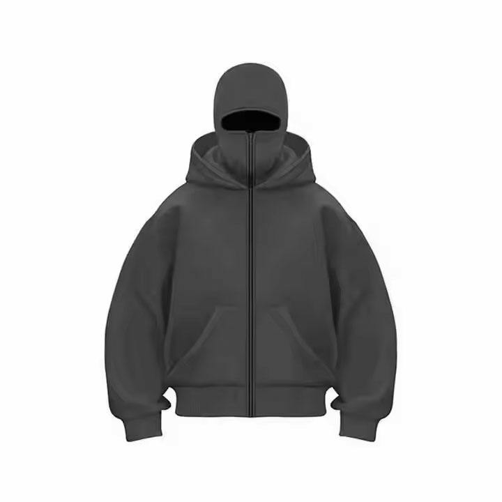 2025 Latest Design Custom 450gsm Zip Balaclava Hoodie Men High Quality Streetwear Plain Cotton Zipper Ninja Hoodies Men
